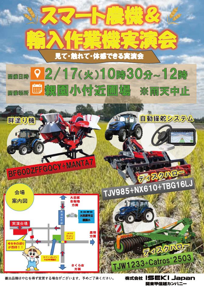 「スマート農機&輸入作業機実演会」in栃木のご案内 2026/2/12 2026年2月17日(火)開催!!栃木県大田原市親園小学校付近の圃場にて冨士トレーラの畦塗り機やタリモズ・アマゾーネといった輸入作業機のディスクハロー実演会を開催します。 さらに!!今、注目スマート農機である自動操舵システム装備トラクタ実演も実施していますので是非ご来場ください!! アマゾーネトラクタ作業機スマート農業 ISEKI Japan 関東甲信越カンパニー