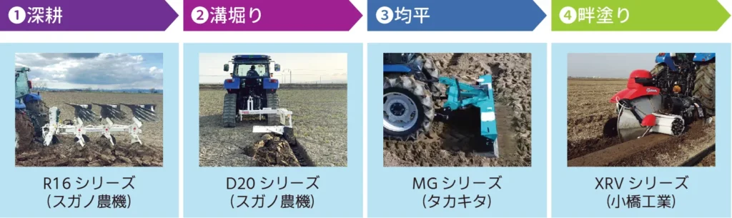 乾田直播では圃場に水を入れるまでに図のような作業を行います。大型トラクタの体系でも中型トラクタでも行う作業は同じです。