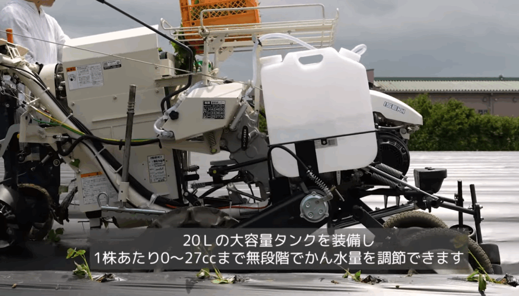 かん水装置を標準装備しており、植付と同時にホッパから株元へかん水することができます。かん水装置のタンクに液体タイプの納豆菌の力を入れることで、簡単に施用することができます。