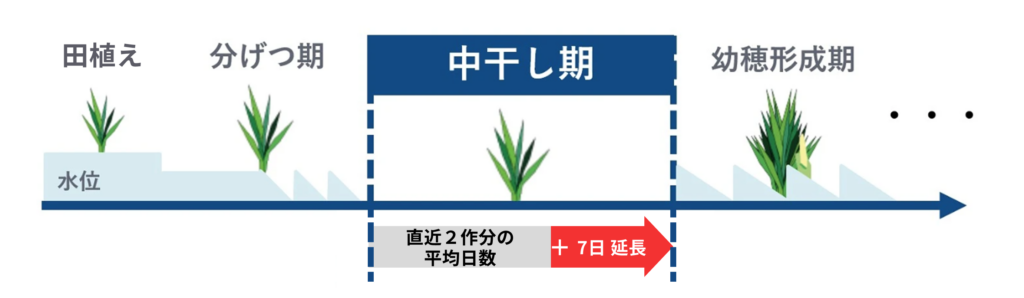 中干し期間延長の必要要件は「直近2か年以上の実施日数の平均より7日間以上延長すること」です。