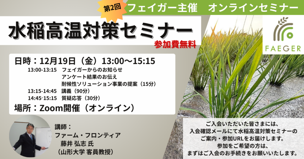 フェイガーでは、2024年夏に実施した「水稲高温対策セミナー」につづき、12月に第二弾となるオンラインセミナーの開催を決定しました。