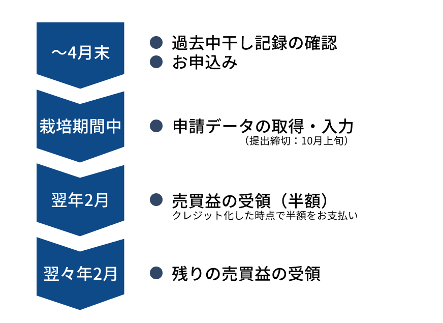 データが確認され、クレジット化が完了すると、取り組み翌年2月に売買益の半額が支払われ、クレジットの最終精算を経て、翌々年2月に残りの売買益が支払われる流れです。