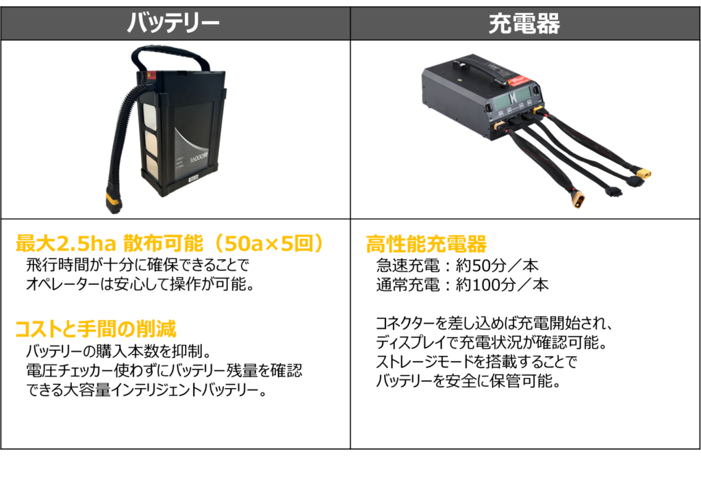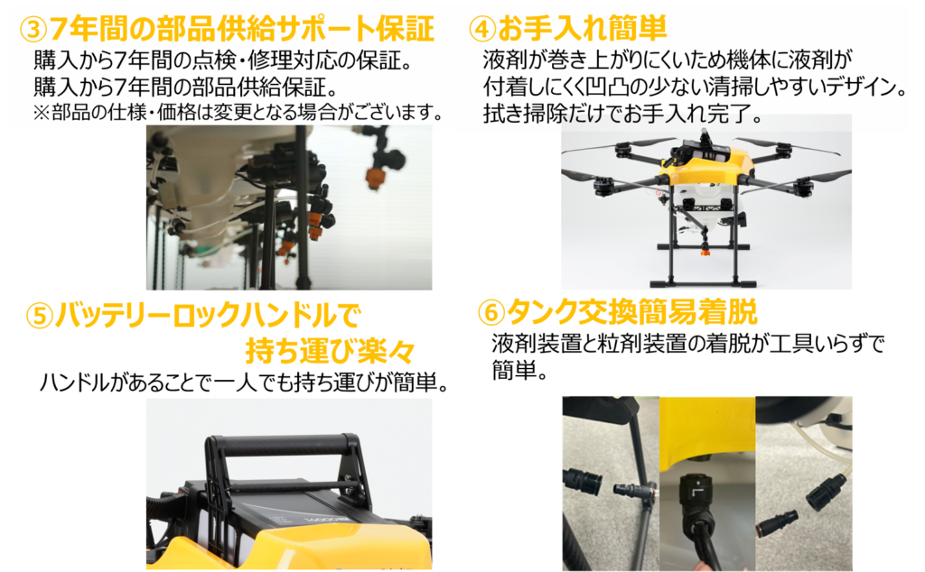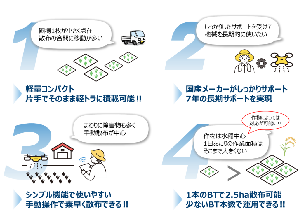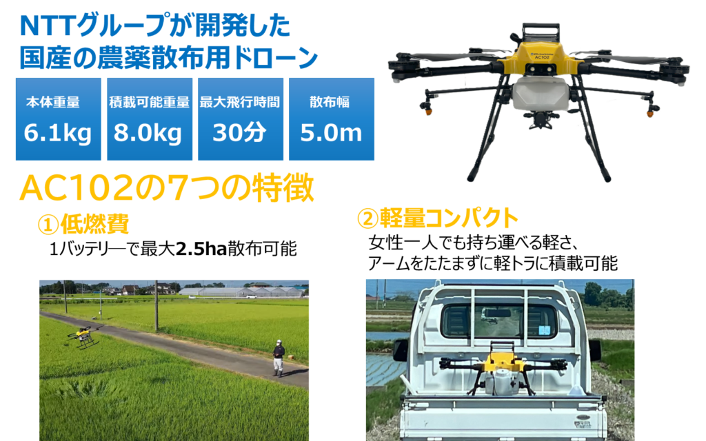 農業用ドローンAC102は、NTTグループが開発した『国産』農業用ドローンです。『軽量・コンパクト・低燃費』をコンセプトとして設計されており、女性1人でも持ち運べることができます。また、軽量でできているため燃費も良く、購入するバッテリー本数も少なくて済むため経済的です。