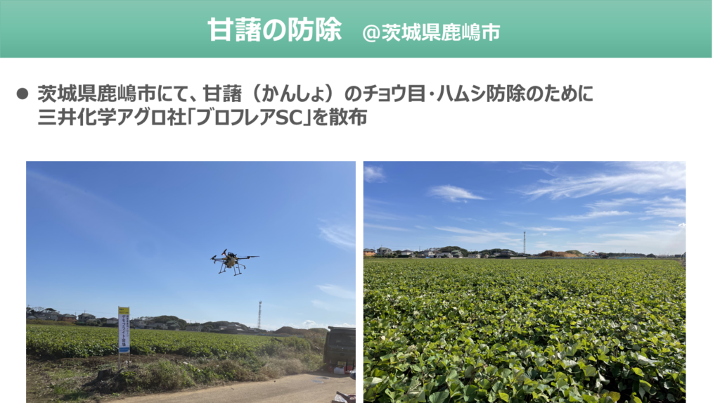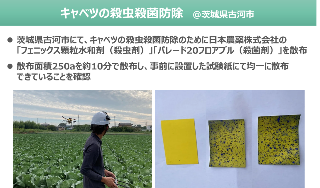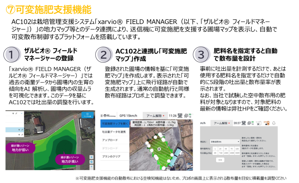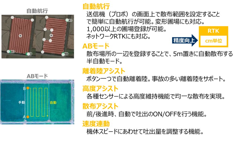 ネットワークRTKを利用することで10㎝単位の測位精度で自動航行を行い効率的な散布が可能です。
