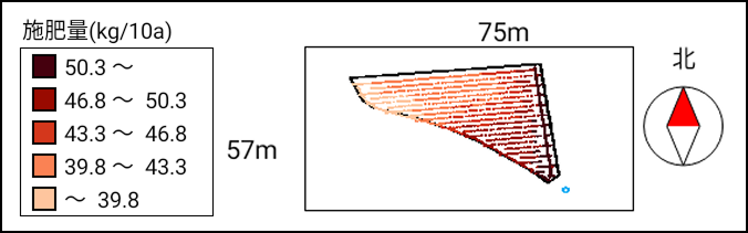 また、全層施肥から可変施肥(側条施肥)に変更するに伴ってそもそもの基準施肥量を減らすことができるのでないかという事で、一部のほ場で基準施肥量を41kg/10a(前年から10%削減)としてMAPを作成しました。