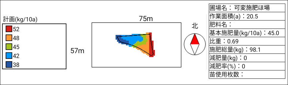また、全層施肥から可変施肥(側条施肥)に変更するに伴ってそもそもの基準施肥量を減らすことができるのでないかという事で、一部のほ場で基準施肥量を41kg/10a(前年から10%削減)としてMAPを作成しました。
