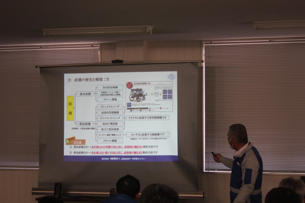 乾田直播の基礎知識ならびに一連の作業の流れについて学びました。従来の乾田直播の体系は100馬力前後のトラクタ向けの作業でしたが、50馬力クラスからのトラクタでもできる乾田直播を広めていく必要もあります。そのために今回、新たな体系での乾田直播について取り組む研修を行いました。