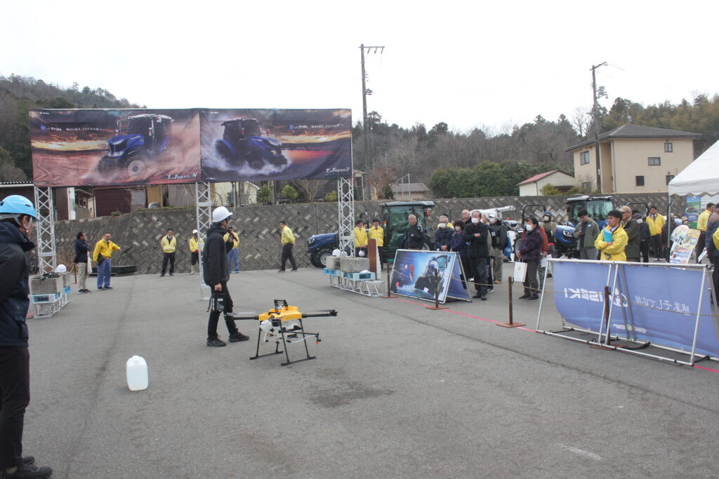 試乗コーナーでは簡易レベラーや自動操舵システムについての紹介、NTTe-Drone Technology様によるAC102のデモフライトを行っていただきました。そのほかにも新型コンバインの紹介、トラクター無段変速の紹介も行いました。
