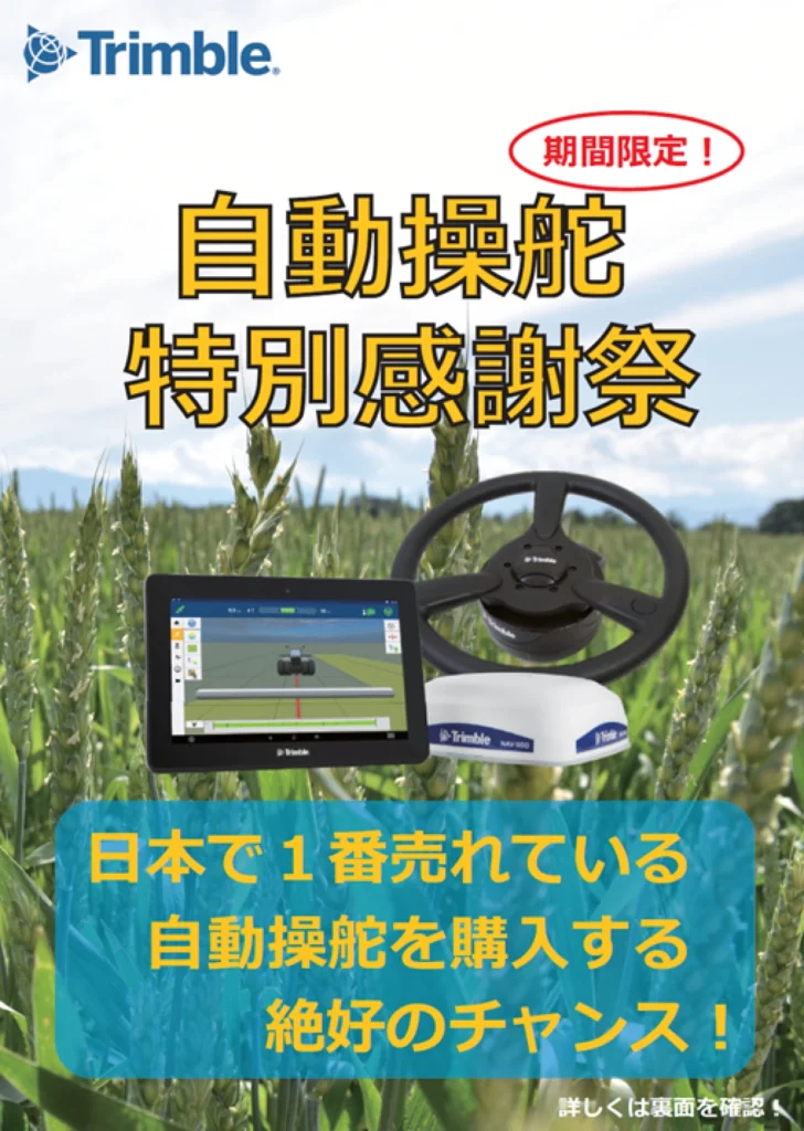 業界唯一のトリンブルの自動操舵3年修理保証は、多くの利用者様が安心・安全に日頃の農作業でご利用頂いている理由でもあります。