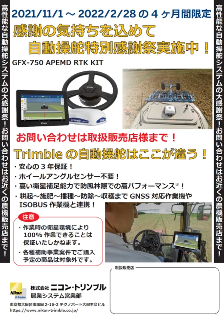 2003年、光学機器のニコン社と米国GPSメーカートリンブル社の合弁企業として創業以来、トリンブル社製の最先端スマート農業用機器(GNSSガイダンス・自動操舵システム)を販売している。トリンブル社のスマート農業用機器は全世界で累計35万台以上販売されており、日本でも多くのユーザーが様々な農作業で活用している。