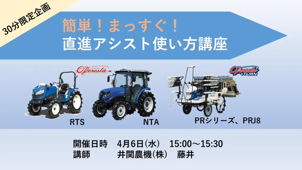 簡単まっすぐ! 直進アシストオペレスタ搭載トラクタ(RTS、NTA)・田植機(PRシリーズ、PRJ8)の便利な使い方とポイントをご紹介。