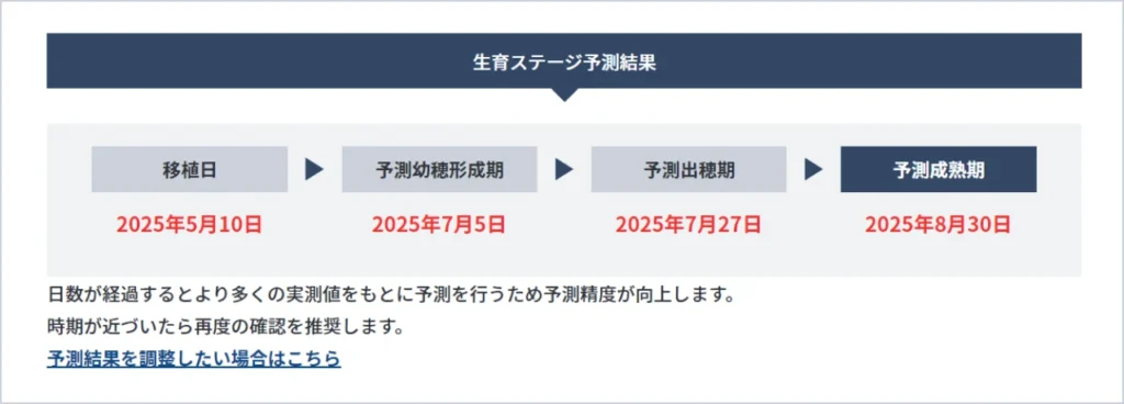 下記は、つくばみらい市の圃場でコシヒカリの稚苗を2025年5月10日に移植した場合の予測結果のサンプルです。
