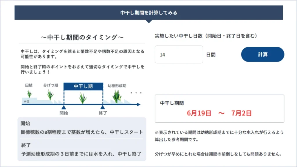 予測を行い結果が表示されると、ページ下部に中干し時期の予測欄が表示されます。中干し日数を入力すると、予測幼穂形成期を基準に中干しの開始日と終了日を計算します。