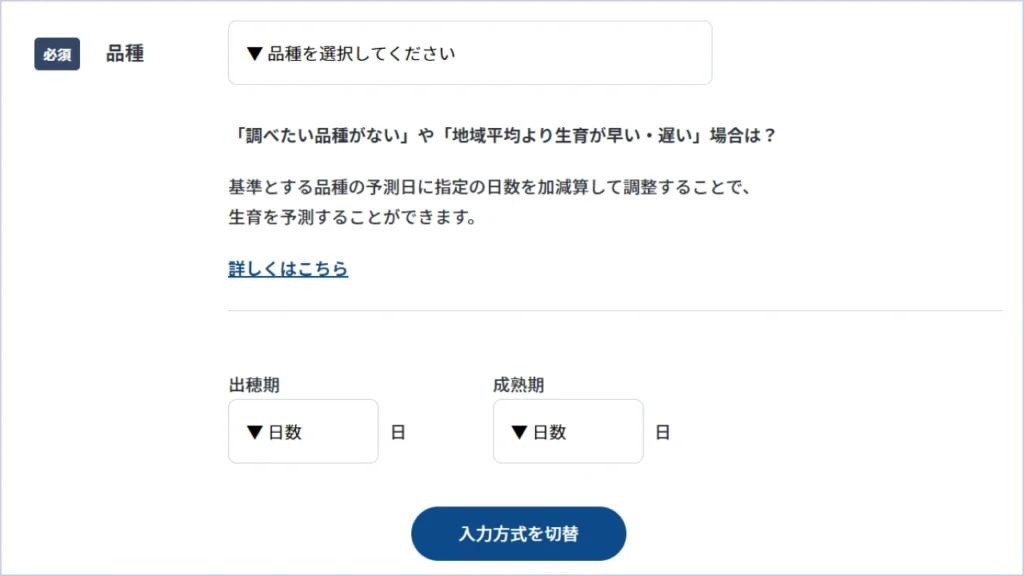 水稲生育予測機能に無い品種を予測したい時は、その品種に近い品種を基準にして予測を行います。