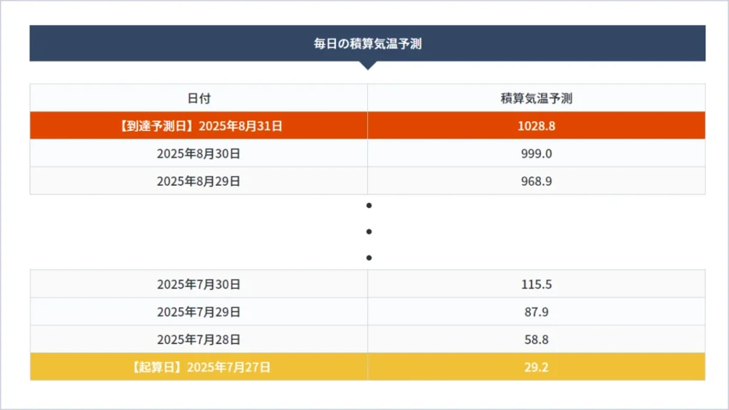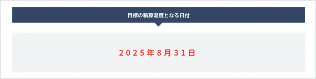下記は、つくばみらい市の圃場で2025年7月27日を起算日として、積算温度が1000℃に到達する日を予測した場合のサンプルです。